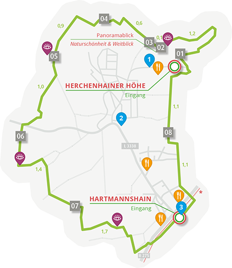 „Herchenhainer Höhe“ an der Rasthausstraße, am Parkplatz „Festplatz Herchenhain“ oder an dem am Vulkan-Radweg gelegenen Parkplatz in