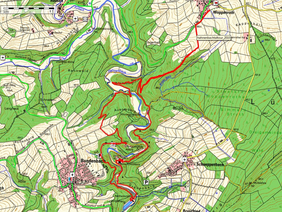 Wegbeschreibung Hahnenbachtaltour Start/Ziel: In 55626 Bundenbach Abzweig Burgweg -> Friedhofsweg zum Besucherbergwerk Herrenberg -> Parkplatz Da ich von "Woppenroth" gestartet bin, hat sich der Rundweg für mich um ca. 8 Km und 40 Hm verlängert! Vom Startpunkt am Besucherparkplatz folgen wir zunächst unserer Markierung und der Markierung Soonwald-Steig zum Besucherbergwerk Herrenberg und dem Fossilienmuseum. Weiter führt uns der Weg vorbei an der rekonstruierten Keltensiedlung Altburg auf einer Strecke von ca. 500 m bergan, bevor wir vom höchsten Punkt der Route hinab zum Hahnenbach wandern. Die Schieferhalde Sinsenbach ist Beleg der Bergbautradition im Hahnenbachtal. Von dort haben wir einen herrlichen Ausblick auf die Talauen und können die Stille der Landschaft genießen, bevor uns ein Pfad rechts hinein in den Rennwald führt. Nach kurzer Strecke erreichen wir die Fußgängerbrücke über den Hahnenbach. Danach wandern wir bachaufwärts am Waldesrand entlang bevor der kurze Anstieg zur Ruine Hellkirch beginnt. Die Ruine Hellkirch liegt auf einer Kuppe ca. 60 m über dem Tal. Von dort genießen wir den Blick auf das Hahnenbachtal und auf einen Teil des bereits zurückgelegten Weges. Eine Sitzgruppe lädt uns zur Rast ein. Ein steiler Pfad führt uns nun den schmalen Kamm ca. 300 m weit hinab. Wir folgen jetzt dem naturbelassenen Waldweg in Richtung Schmidtburg. Grenzsteine aus dem 19. Jahrhundert künden von der ehemaligen Bedeutung des Weges: GO = Großherzogtum Oldenburg, KP = Königreich Preußen. Heute stoßen hier die Grenzen der Landkreise Rhein-Hunsrück, Bad Kreuznach und Birkenfeld aneinander. Nach Queren eines kleinen Baches erreichen wir den Wassererlebnispfad Hahnenbachtal. Wir folgen diesem Weg vor-bei and er ehemaligen Schleifmühle Götzenau und der „Teufelsrutsche“ zu den Ruinen der mächtigen Schmidtburg, die schon dem Räuberhauptmann Schinderhannes als Versteck diente. Von der Burg aus genießen wir die Ausblicke ins Tal der Jahrtausende, wie das Hahnenbachtal in diesem Abschnitt auch genannt wird. Von der Schmidtburg aus wandern wir wenige Serpentinen hinunter zum Hahnenbach und gelangen wieder bachabwärts über eine Brücke auf die andere Seite des Baches bis zum Forellenhof Reinhardtsmühle. Der Weg führt uns in Serpentinen bergan. Wir wandern durch Felsentunnel, die einst zum Schieferabtransport dienten und genießen mehrfach die reizvollen Ausblicke auf die Ruine Schmidtburg und die darüberliegende Altburg. Nach einem kurzen Anstieg sind wir wieder am Start angelangt. Schöpfen Sie bei dieser Wanderung körperliche, geistige und vor allem emotionale Fitness für Ihre ganz persönlichen Herausforderungen im Alltag. Lassen Sie Ihre Seele baumeln… Text aus dem Hahnenbachtaltour Fleyer Gut 5 ½ Std. war ich mit Pause auf dem schönen Rundweg unterwegs. Diese Rundwanderung mit Einkehr im "Hotel-Restaurant Forellenhof" habe ich bei sonnigem Wetter sehr genossen und werde diese so schnell nicht vergessen. |