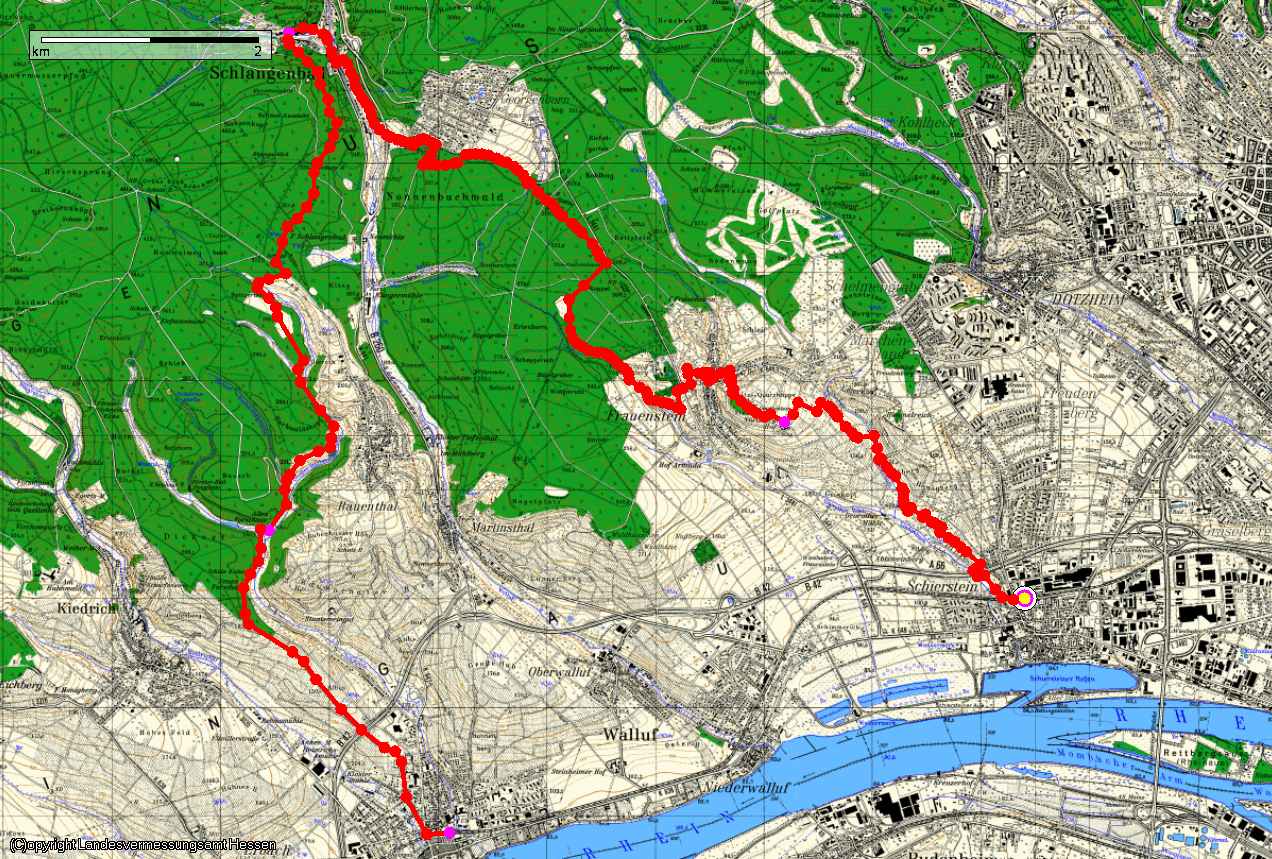 dem alten Forsthaus führt. Nach Kaffee und Kuchen geht es weiter auf der Straße nach Eltville (roter Punkt) rechts Bergauf in den Wald.